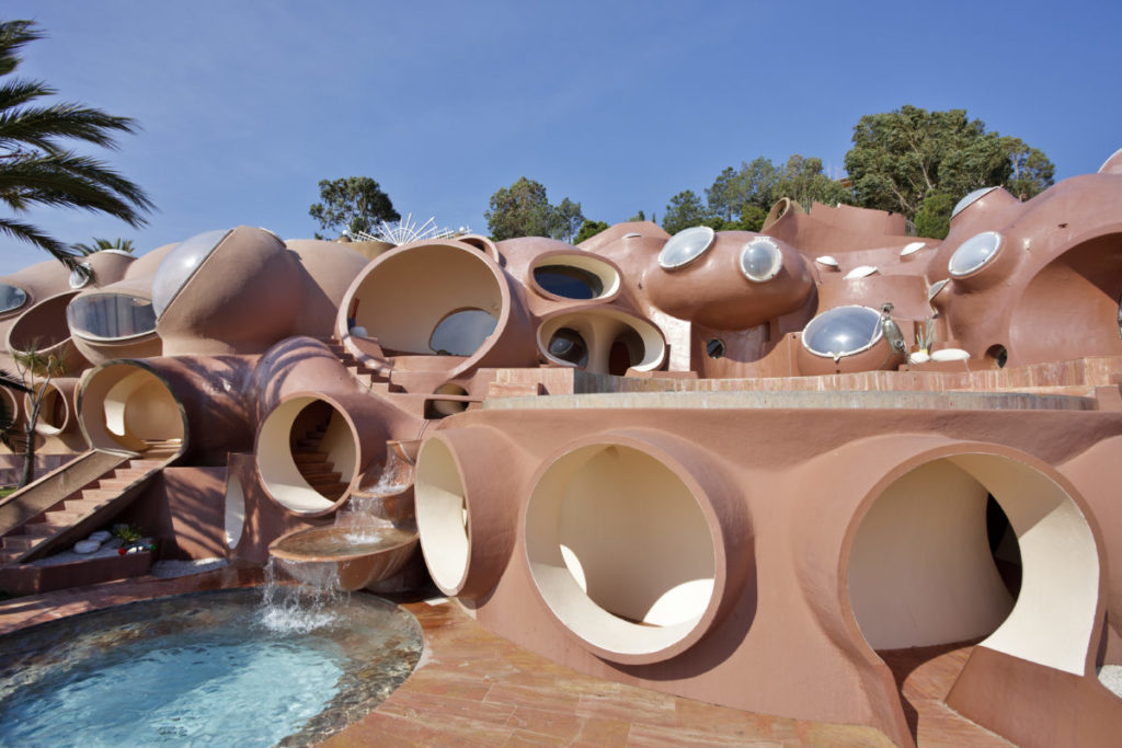 Perchée sur les collines de Théoule-sur-Mer, la Bubble House, ou Palais Bulles, ressemble à une constellation de bulles géantes surplombant la Méditerranée. Conçue par l’architecte hongrois Antti Lovag entre 1975 et 1989, cette villa organique est un hymne à la courbe et à la fluidité. Chaque pièce est ronde, chaque terrasse semble suspendue dans l’air, et la lumière naturelle inonde l’intérieur grâce à des ouvertures qui épousent les formes des sphères.